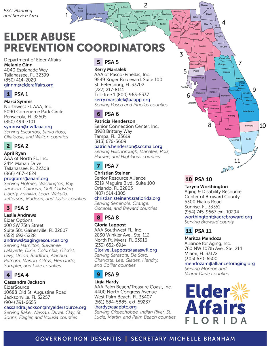 The DOEA Elder Abuse Prevention Program supports programs and services to protect elders from abuse in all forms, physical, emotional, and financial. In partnership with the Department of Children and Families Adult Protective Services, DOEA and the Aging Network work to protect disabled adults or elderly persons from further occurrences of abuse, neglect or exploitation. Services provided may include protective supervision, placement, and in-home and community-based services.